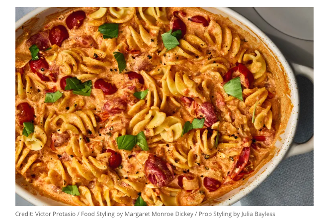 The dish traces back to a recipe created by food blogger Jenni Häyrinen, built around an uncomplicated idea: combine a block of sheep-milk feta cheese with a couple of pints of cherry tomatoes and let heat transform them into something richer than the parts alone. That simplicity is also what makes it so dependable for weeknight cooking. With the right pasta shape and a few aromatics, it becomes a complete dinner that feels comforting without being complicated.