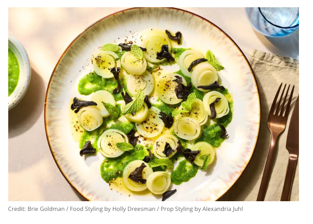 Leeks are often treated as a supporting ingredient—used to add gentle onion-like flavor to soups, stews, and braises. In this dish, however, leeks are presented as the main attraction. The approach is simple but intentional: the whites are simmered until tender while the greens are cooked briefly and blended into a smooth purée. Together, they create a composed plate that highlights the leek’s delicate flavor and soft texture.