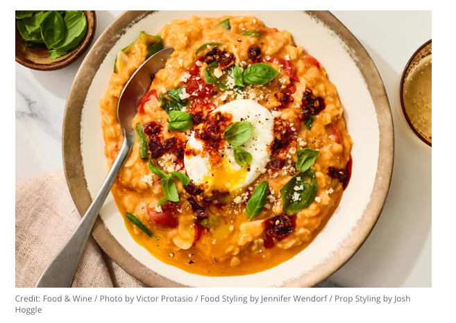 The approach is simple: sauté aromatics in butter, simmer tomatoes with tomato paste and wine until concentrated, then cook rolled oats directly in chicken stock until creamy. Basil and Parmigiano-Reggiano are stirred in at the end, and the oatmeal is served immediately with a freshly poached egg on top. It’s designed to be warm, savory, and deeply satisfying, with enough body to hold up as brunch or an easy lunch or dinner.