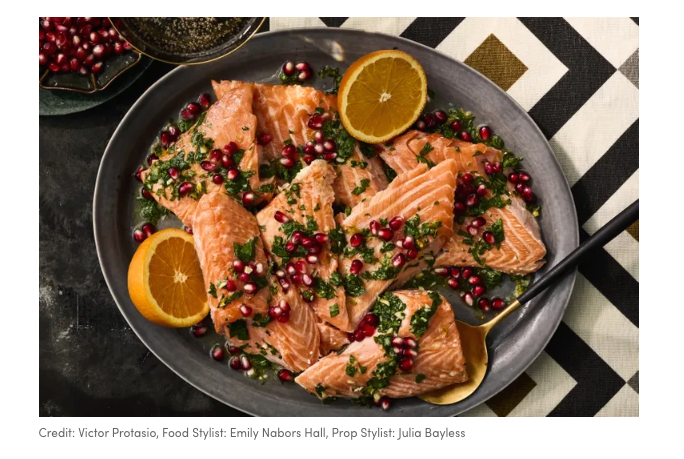 Gremolata-style topping: A herby-garlicky mixture finishes the salmon. While gremolata is traditionally made with parsley and lemon, this version includes mint, orange, and pomegranate arils for bursts of sweetness.